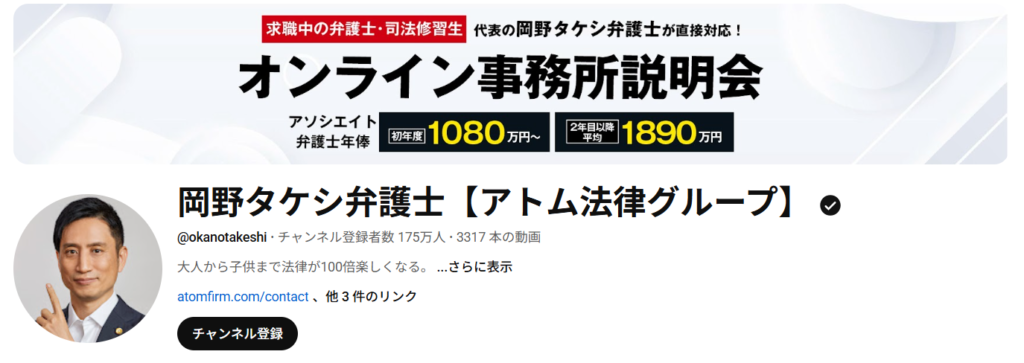 | YouTubeチャンネル名 | 岡野タケシ弁護士【アトム法律事務所】 |